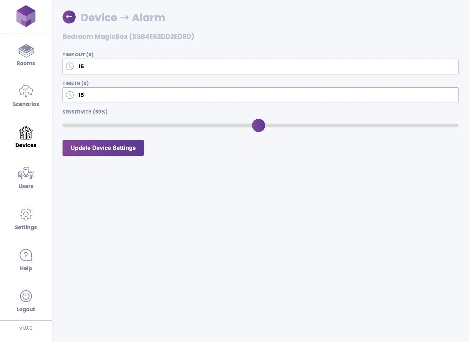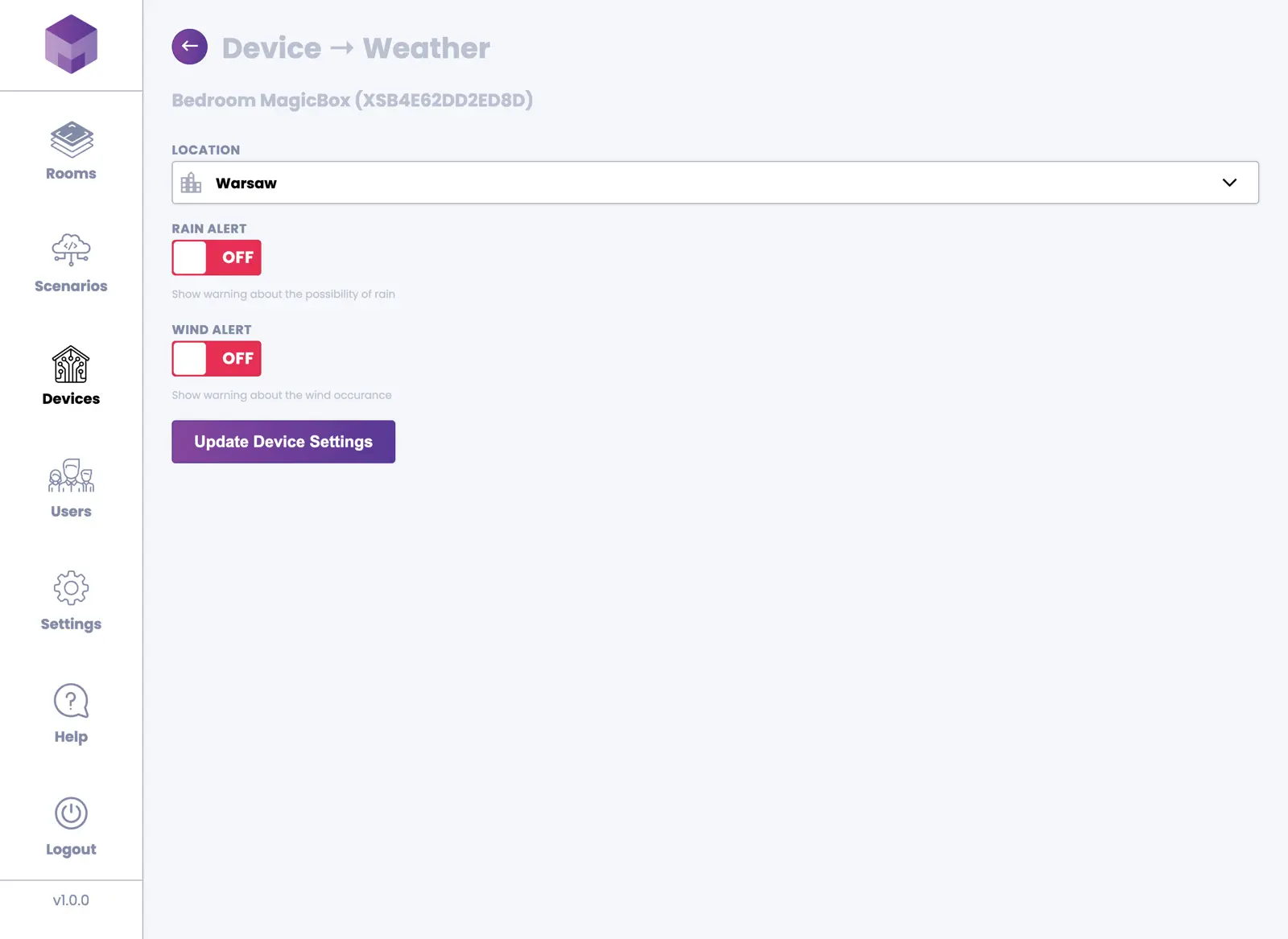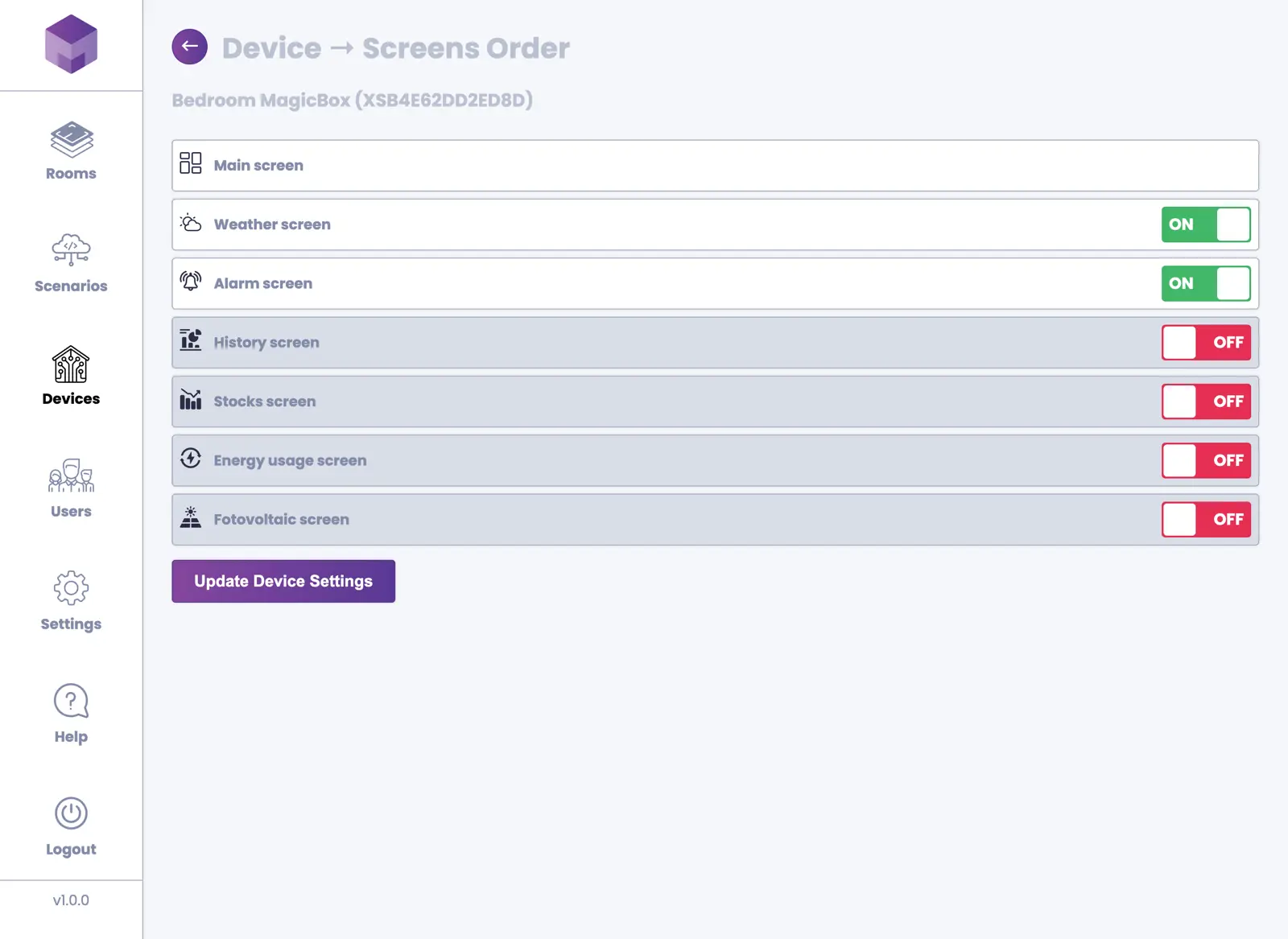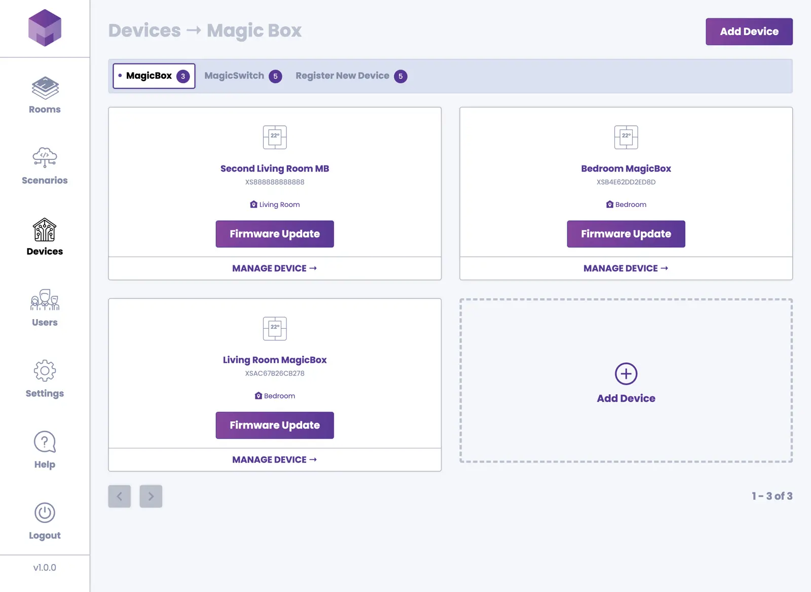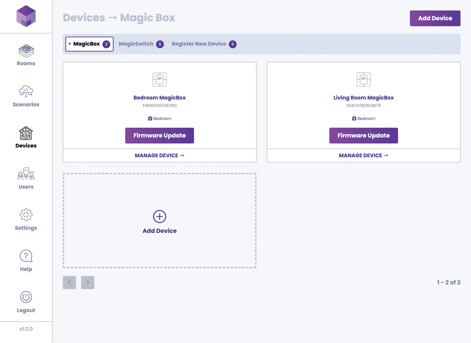 You can manage devices from the Devices section in the application. Devices are divided into two categories: MagicBox® devices and MagicSwitch® devices.
