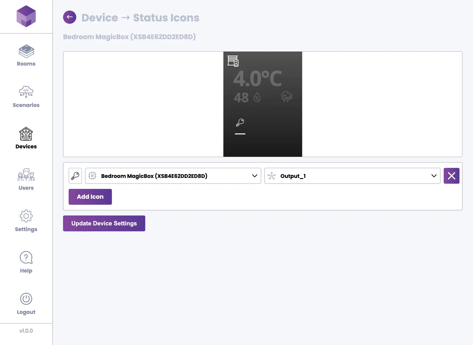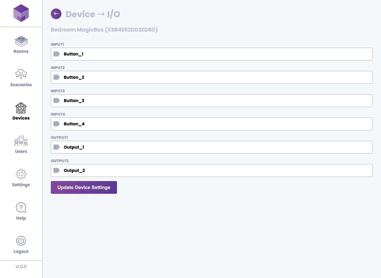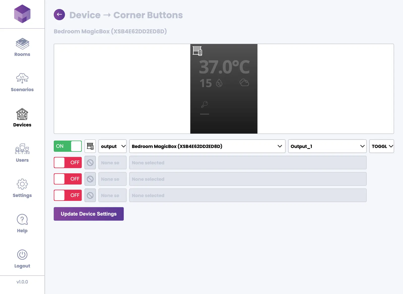 The MagicBox® device has four physical buttons. You can assign a scenario or specific output to each button. Assigning a scenario gives you the option to turn it ON, OFF, or TOGGLE. Selecting an output allows you to choose the output of a specific device and toggle it ON or OFF.