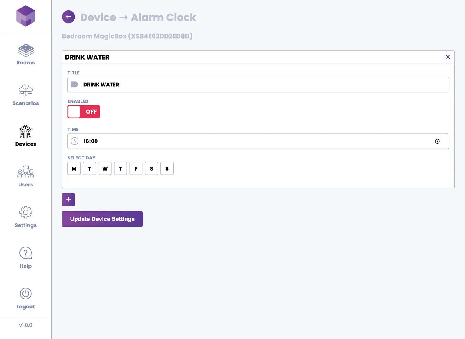 The MagicBox® device allows you to configure an alarm clock. You can set up a one-time alarm or configure a recurring alarm to activate at specific times on specific days.