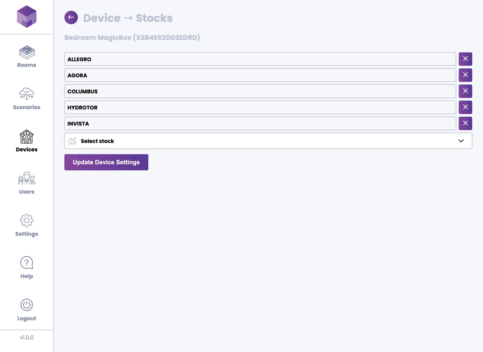 The Stocks screen allows you to select which stocks you would like to monitor. Select a stock from the dropdown menu and add it to your list. The selected stocks will be displayed on the MagicBox® screen with real-time updates throughout the trading day.