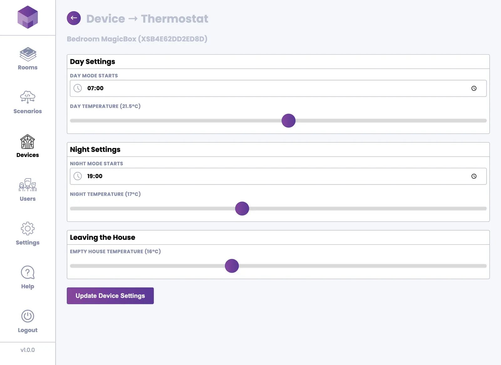Thermostat settings allow you to configure different temperature targets for day and night periods. You can specify when your day and night periods begin. You can also set a "Leaving the house" temperature, which will be applied whenever you leave your home.