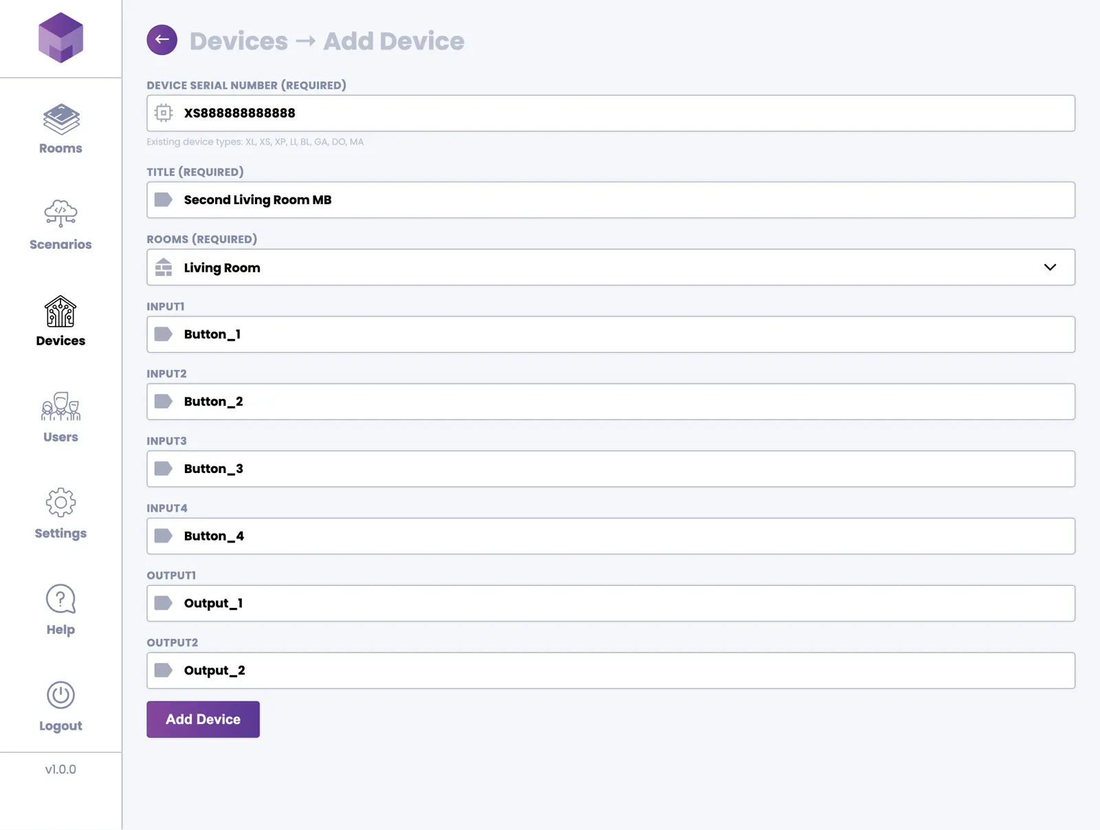 On the "Add Device" screen, you can now enter the device serial number. If you enter the serial number correctly, the application will automatically identify the device type. You will then be able to enter a title and choose a room where you would like the device to be assigned. You will also have the option to name the inputs and outputs on the device for better clarity. Once you are satisfied with your choices, press the Add Device button.