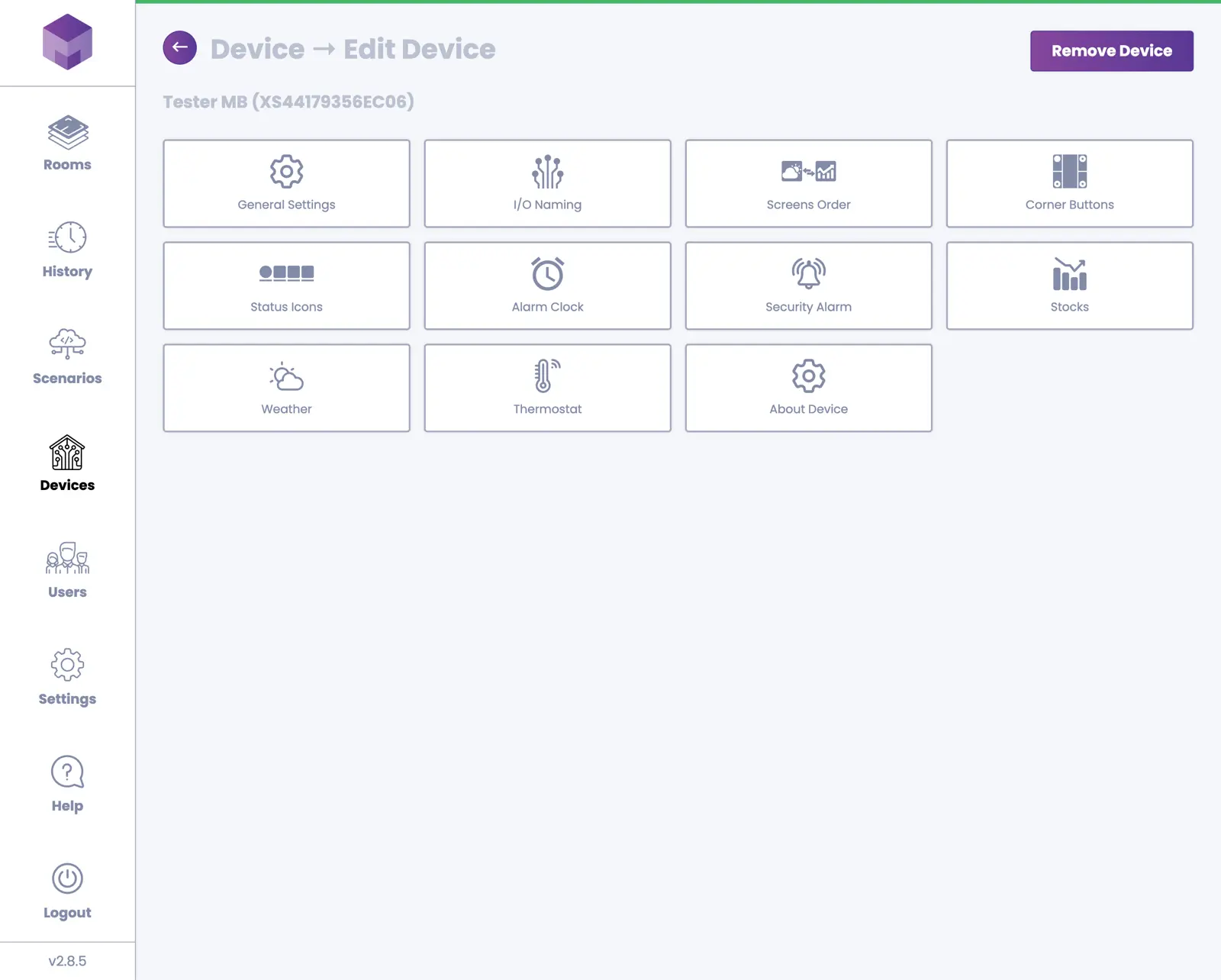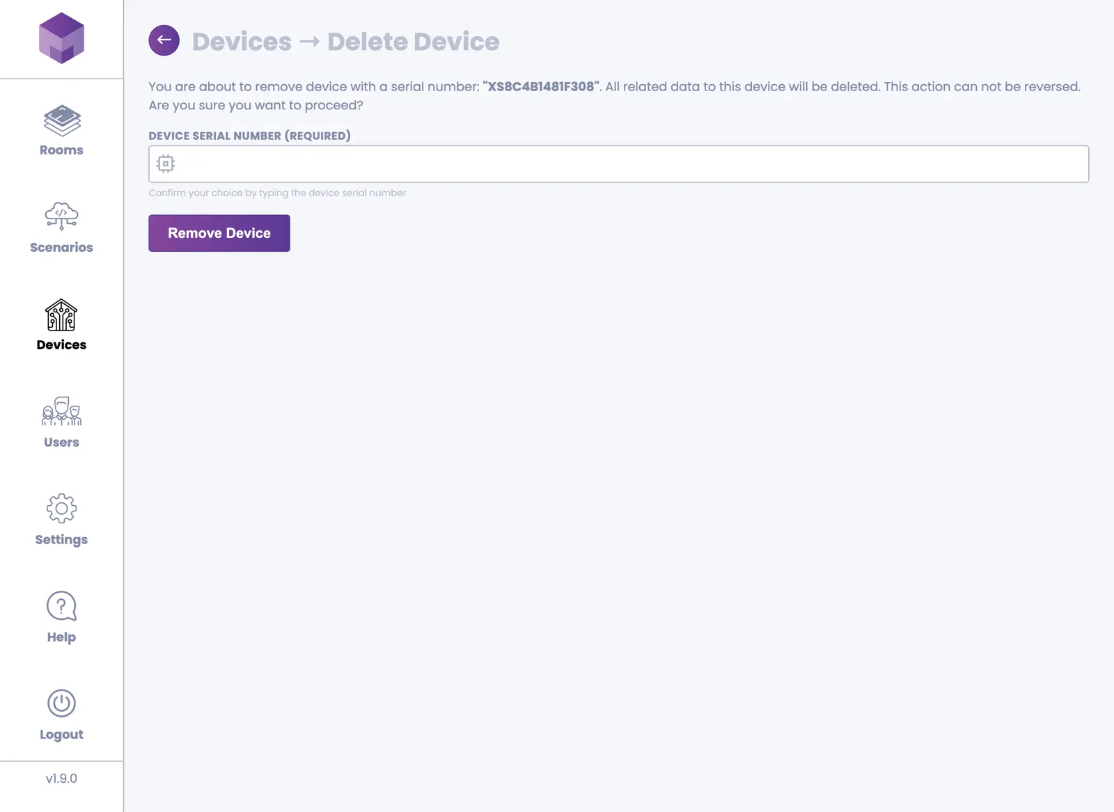 To delete a device, press the "manage device" link at the bottom of the device tile. Once you enter the "Manage Device" screen, press the Remove Device button in the top right corner. This will open the "Delete Device" screen. To delete the device, enter the serial number of the device and press the Remove Device button.
