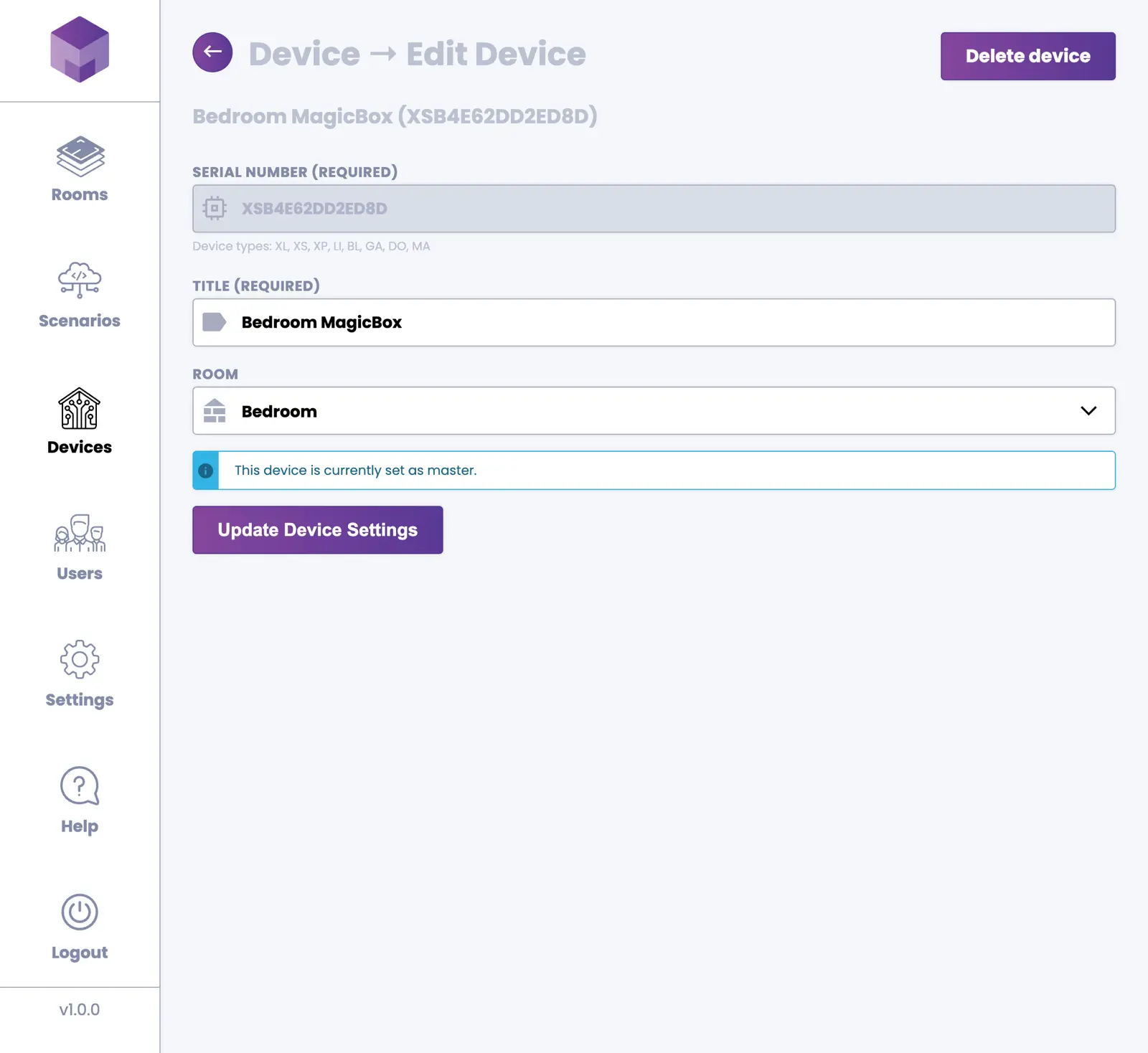 Device settings allow you to change the device title or select a different room to which the device should be assigned. There is always one device marked as "master". This is the main device that manages all other devices in your system.