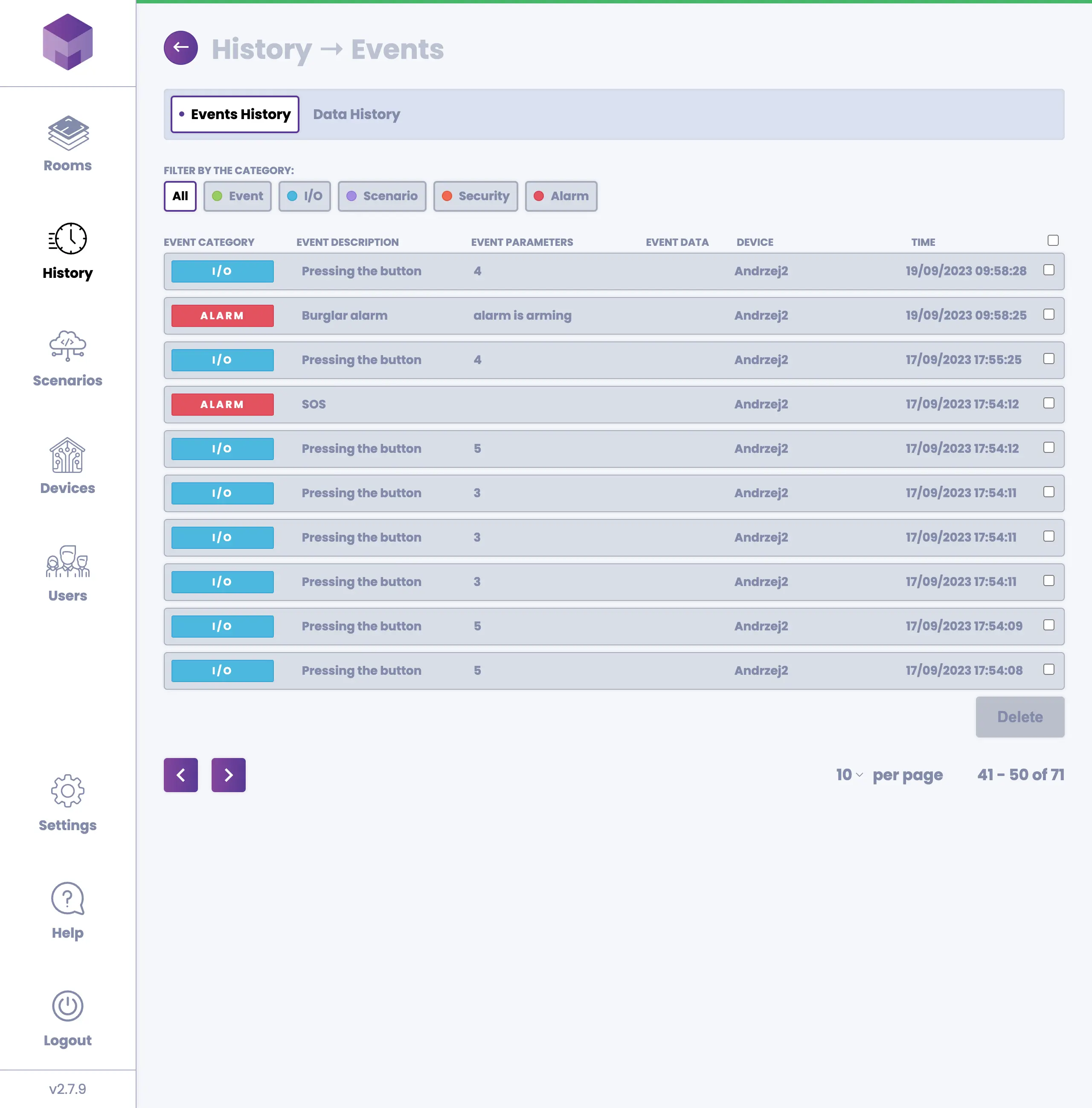 You can manage history from the History section in the application. History is divided into two sections: Events History and Data History.