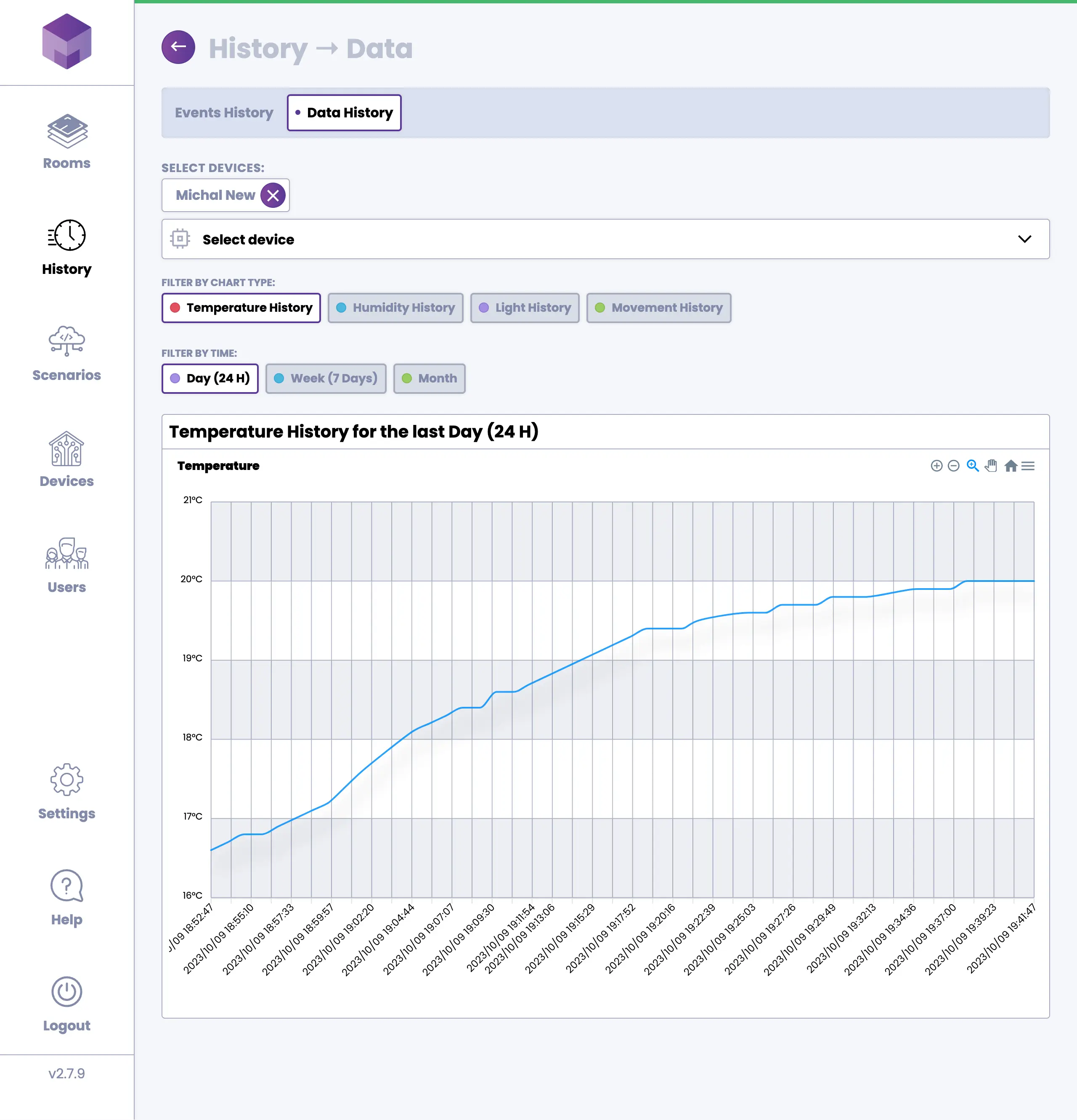 Data History displays recordings of sensor data collected by your devices, including temperature, humidity, light, and movement. To view data history, select one or more devices, choose the chart type (temperature, humidity, light, or movement), and pick a time range (day, week, or month).