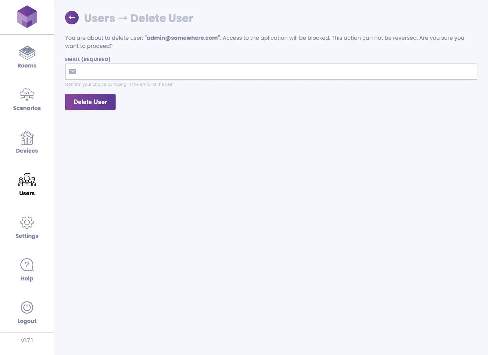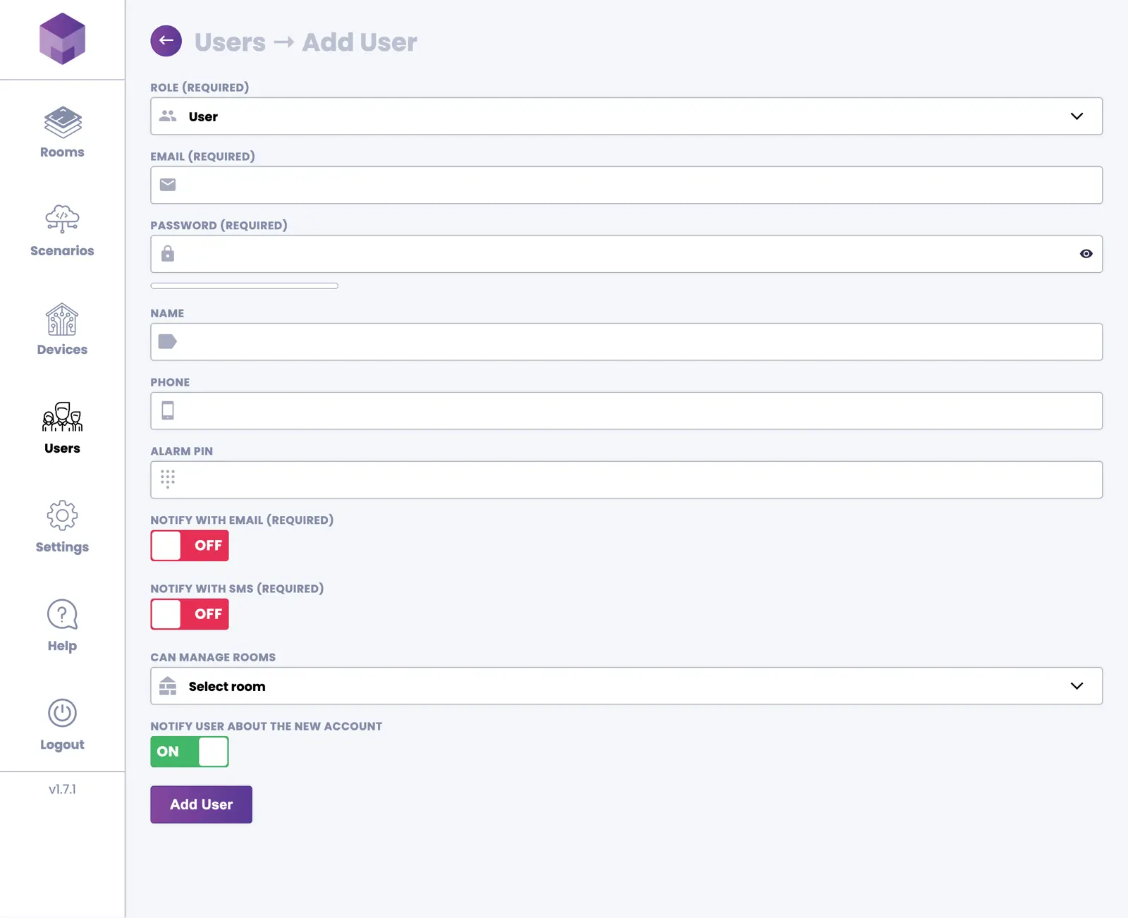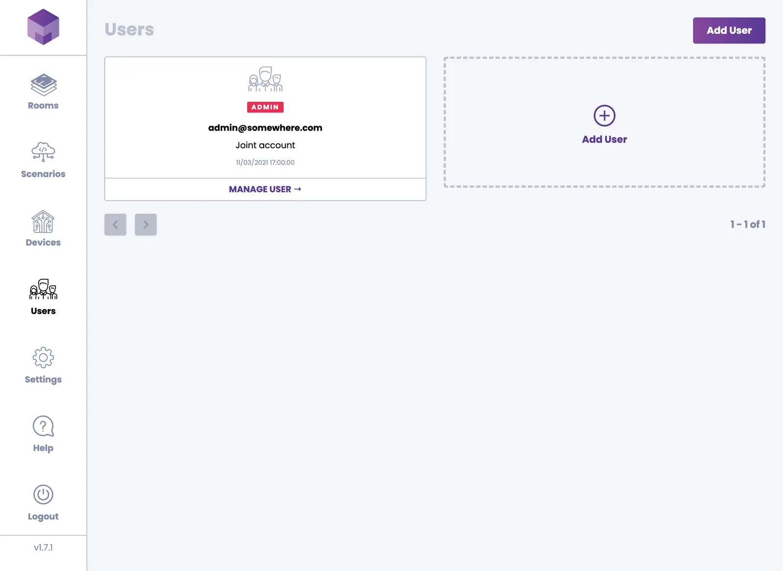 You can create new users to manage the account together with you. They can manage all the rooms related to your account (you can make them administrators) or only specific rooms (you can make them standard users). Click the Users icon on the left-hand navigation to view a list of all current users associated with this account.