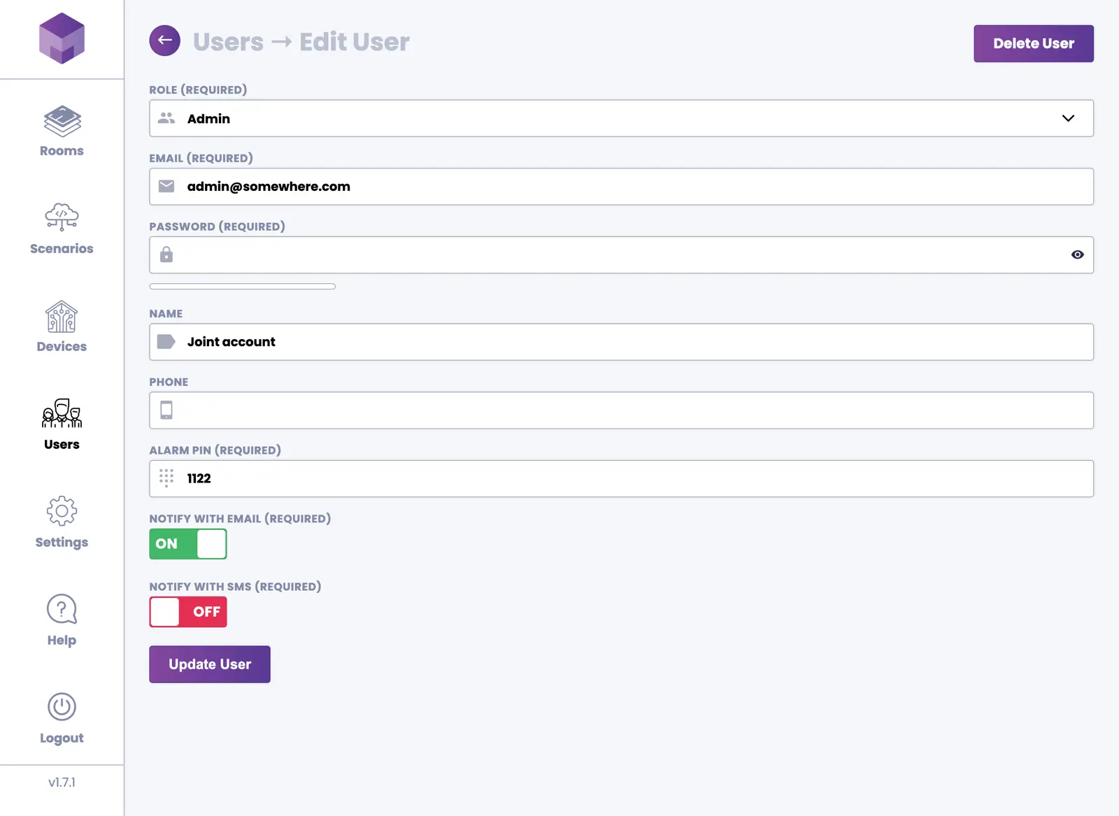 There are currently two roles available. The administrator role grants the user complete control over the account. The user role cannot manage other users and can only manage specific rooms.